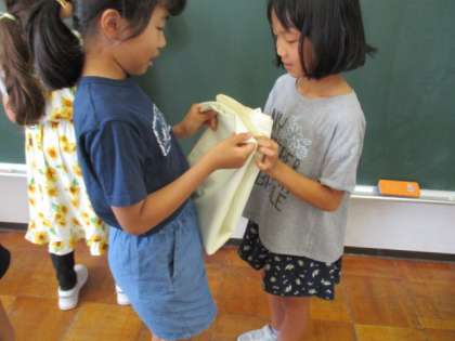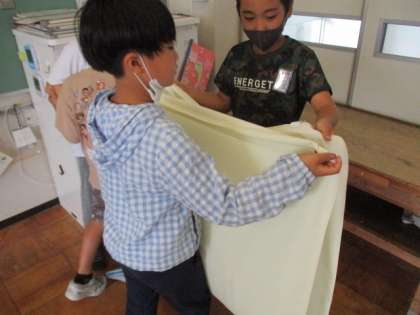 初めての宿泊学習に向けて準備を進めています。出発式などの進行の練習やシーツをたたむ練習をしました。友達と協力して、できることを増やしていきたいです。