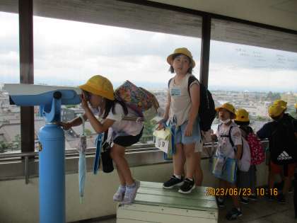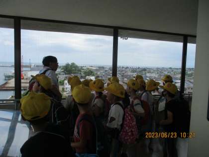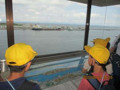 富山港展望台では、海の近くの様子を見ることができました。子供達は東西南北それぞれの方向に何があるのかを詳しく見ていました。