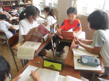 国語科の学習では、環境問題に関して私たちができることについて、提案文を作成しています。各班、水や食料、ゴミ等の身近な問題についてどうしていけばよいのかを考えています。
