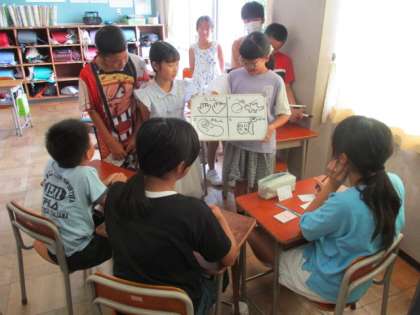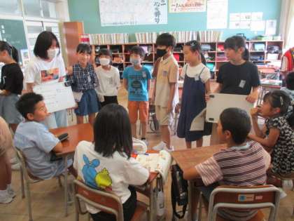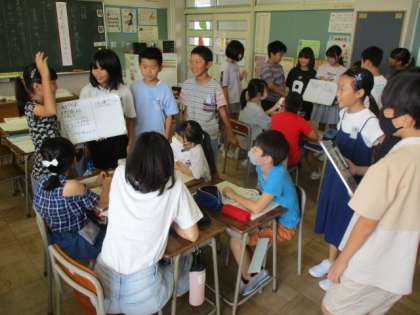 国語科では、対話の学習をしています。「行くなら動物園or水族館」「一度だけ行けるなら未来or過去」などのつい迷ってしまう二択を、チームですすめる活動をしました。どのチームも説得しようと一生懸命取り組んでいました。