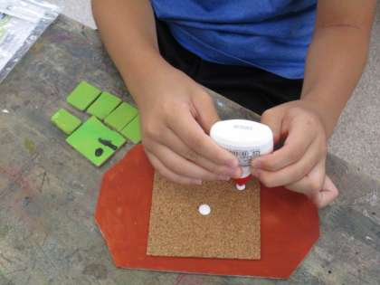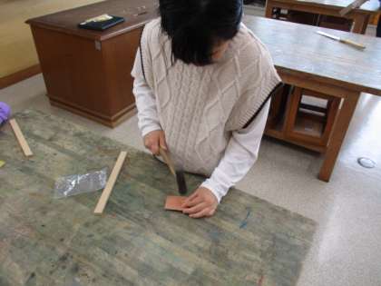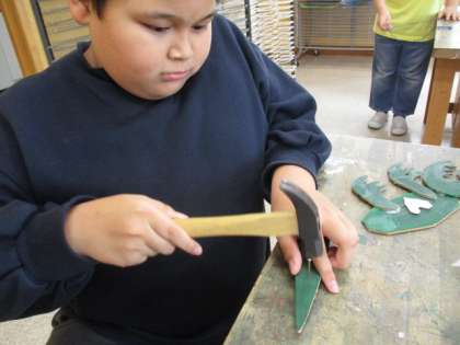 図画工作科「ギコギコトントンクリエイター」では、切った木に色をつけたり、ボンドで貼り付けたりしました。釘打ちもしました。釘が真っ直ぐに入るようにと真剣に取り組んでいました。