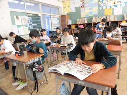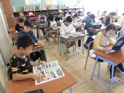読書の時間に、みんなで神明小学校の創校150周年の記念誌を読みました。子供たちはこれまでの神明小学校の歩みがわかる写真を見ながら、昔と今の校舎の違いや行事のようすなどを興味深そうに見ていました。