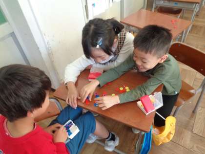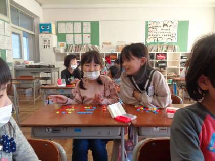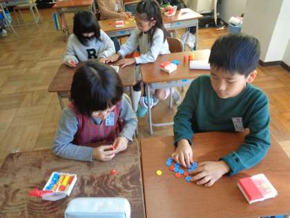 ペアやグループを作って、かけ算の式の場面をおはじきを使って表す問題を互いに出し合いました。子供たちは、自分の問題の場面を友達が正しく表せているかを真剣に確かめていました。
