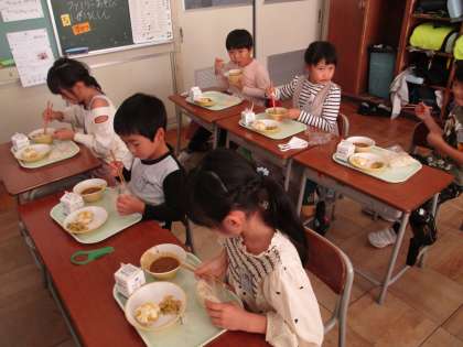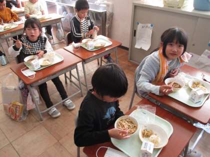 今日の給食は、1年生にとって初めてのソフト麺でした。配膳台に並んだ麺を見て「うどんだ!」「カレーも付いてる!」と珍しさに少し興奮気味の子供たちでした。カレー味の汁が溢れないように、無くならないように麺を少しずつ入れて、美味しく頂きました。