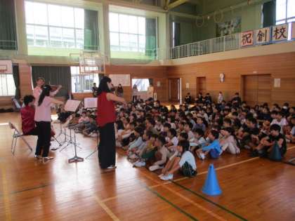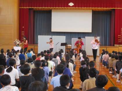 学校コンサート 生演奏を聴いて 公開日 2023/10/19 更新日 2023/10/19 学校行事・児童会活動 今日は、学校コンサートがありました。生の弦楽四重奏を聴かせていただき、どの子供もきれいな音色や、演奏者の方々に興味津々な様子でした。また、お家の人に感想を伝えましょうね!