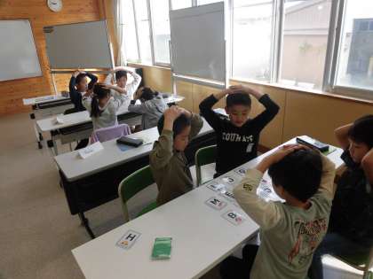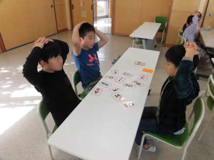 外国語の時間にアルファベットのクイズをしました。かるたのようにカードを並べ、聞こえたアルファベットのカードを取ります。みんな、集中して取り組んでいました。