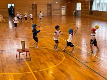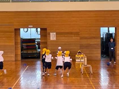 1年生は体育科で、ボール当てゲームに取り組んでいます。投げることに苦手意識をもっている子どもも簡単に楽しめるように、柔らかいボールと段ボールの的を用いて試合をしています。守り方と攻め方の工夫も少しずつ考えられるようになり、ゲームも白熱しています。