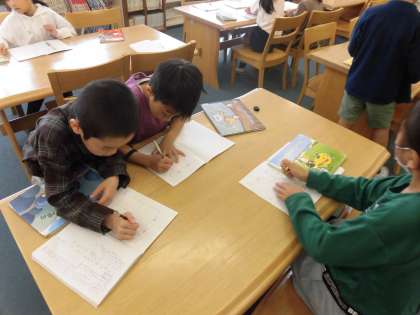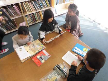 3年生 国語科「はんで意見をまとめよう」 公開日 2023/10/23 更新日 2023/10/23 3年生 国語科で話し合いの学習をしています。「1年生に本を好きになってもらうための読み聞かせ」に向けてこれからみんなで話し合いをしていきます。今日は、それぞれ読んだらよいと思う本を選びました。自分が低学年のときに好きだった本や、読み聞かせをしてもらって楽しかった本など、自分の経験を思い出しながら、楽しそうに選んでいました。