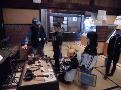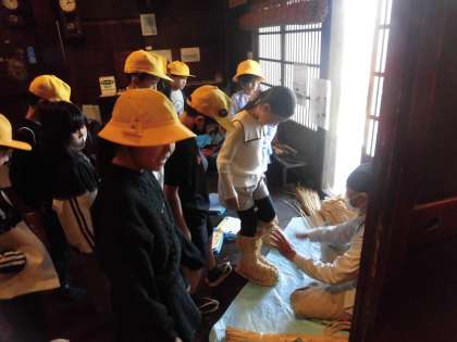3年生 校外学習(富山市民族民芸村) 公開日 2023/10/30 更新日 2023/10/30 3年生 民族民芸村では、100年前のくらしのようすを見たり体験したりしました。わらぐつ体験では、作り方を教えてもらった後、実際に履かせてもらいました。子供たちは、思っていた以上の軽さや暖かさに驚いたようでした。他にも、様々な道具や家のつくりを知ることができました。