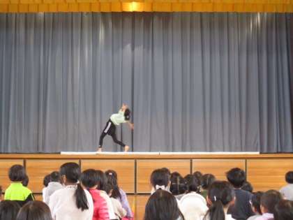 神明ショータイムが行われ、4年生からも1名参加しました。体操を披露し、バック転や体の柔らかさを表現しました。見ている人たちからは「すごい」という声が聞こえてきました。