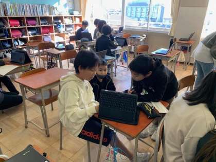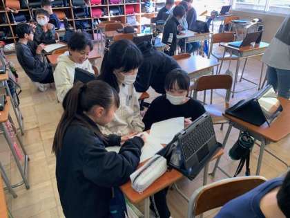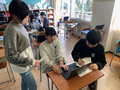 総合的な学習の時間には、自分の将来の夢について調べたことをまとめたスライドを、みんなで見合いました。まとめ方を工夫して、友達のスライドのよさを見付けることができました。