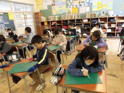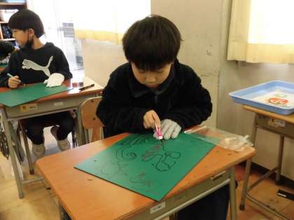 3年生の版画の学習では、彫刻刀を使うことにチャレンジします。今日の学習では、最初に、全員で彫刻刀の種類や安全な使い方について学習をしました。その後、自分の描いた模様の線を彫りました。安全に気を付けて取り組み、すてきな作品を作りましょう!