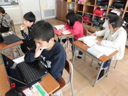 国語科の学習で詩を作りました。前時の学習では詩のくふうを見つけたので、それをもとに使う言葉や読み方、表現したいことなどを考えました。どんな詩ができあがるのか楽しみです。