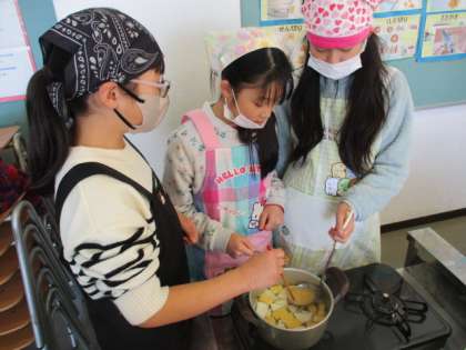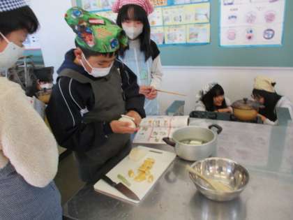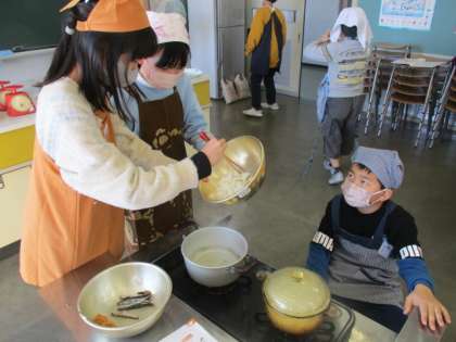 今日の家庭科では、調理実習を行いました。1・2学期に行った田植え、稲刈り体験の際にいただいた4種類のお米を炊いて、食べ比べたり、煮干しからだしを取って味噌汁を作ったりしました。楽しみながら班で協力して進めることができましたね!!