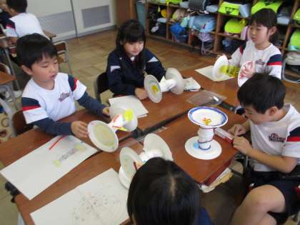 1年生の図画工作科では「かみざらコロコロ」の学習を行いました。紙皿と紙コップを用いた単純な作りなのに、組み合わせると床をすいすい進むおもちゃの完成です。思い思いに絵を描いたり、飾りを付けたりして、個性的な作品がたくさんできました。息を吹きかけたり、坂道を転がしたりして、みんなで楽しく遊びました。