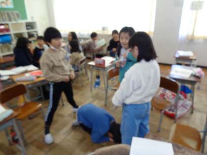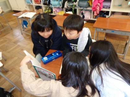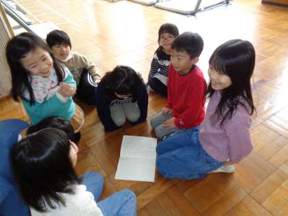「おにごっこ」の学習のまとめに、遊びについて書かれた本を読んでグループの友達に自分の選んだ遊びを説明しました。