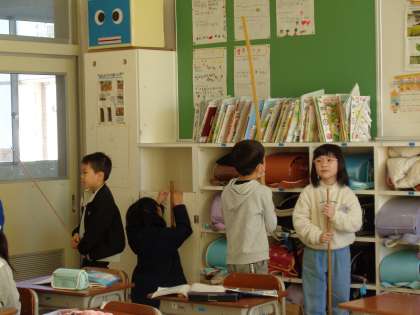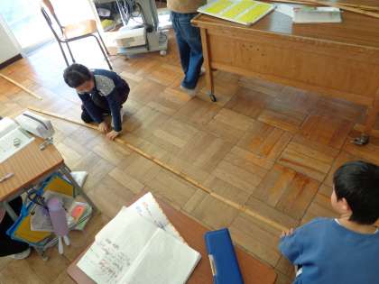 mmやcmよりも長い、長さをあらわす単位mを学習しています。子供たちは1mの量感をつかんだり、1mものさしを使って教室の端から端までを測ったり楽しみながら活動しました。