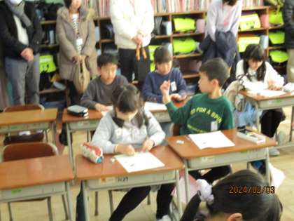 1年生はインターネットを使用する際の約束の意味について考える道徳の学習を行いました。映像を見て考えたことを、一生懸命考えてワークシートに書いたり、友達と話したりしました。最後は、自分に合った約束を考え、これから気を付けていこうとする気持ちを高めました。