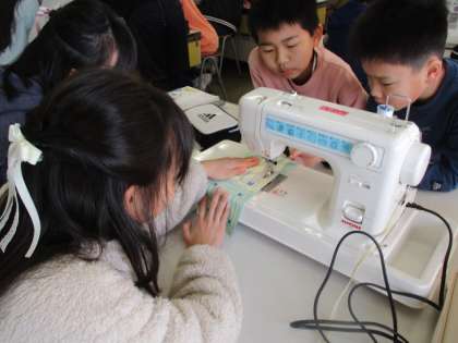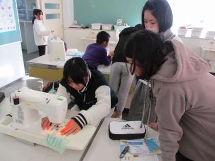 今日の家庭科では、実際にミシンで布をぬってみました。ぬい目を見て「え、すごい。こんなきれいに縫えるの!?」とおどろいてました。