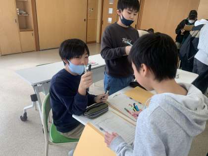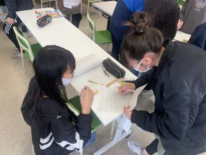 小学校の思い出について聞き合う、インタビューゲームをしました。今日は、前の時間に学んだ様々なリアクションを使って、会話をしていました。