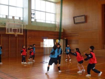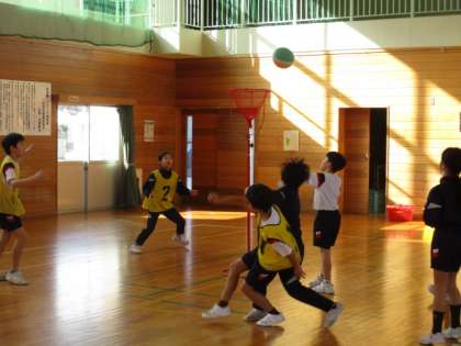 体育科ではバスケットボールに取り組んでいます。ゴールを玉入れのかごにすることで、周囲からシュートできるようにしています。回を重ねるごとに、相手の動きを見てパスカットをしたり、ドリブルでゴール近くまで攻めたりできるようになってきました。試合が白熱してきました。