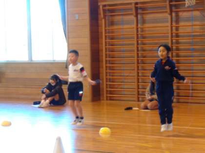 全校の先頭をきって、低学年の縄跳び交流会が行われました。子供たちは、これまで体育の時間や休み時間に練習してきた成果を発揮しようと、真剣に1分30秒を飛び続けました。終わった後は、みんなすっきりと晴れ晴れとした顔をしていました。