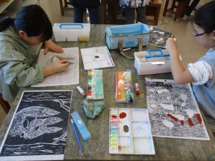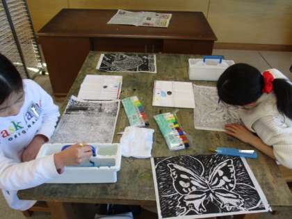 図画工作科の版画では、刷った作品に紙の裏から色を付けました。白黒でも素敵ですが、色が付くことでリアル感が出てさらに素敵になりました。