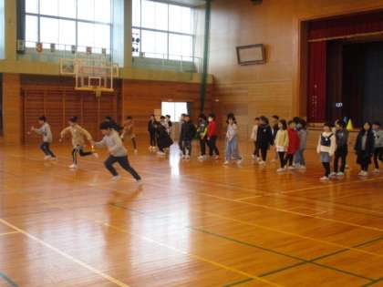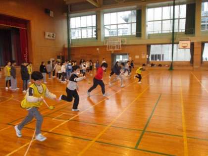 3月7日(木)の神明陸上記録会の日に行われるファミリー活動、「ファミリーボール運びリレー」の連優をしました。今日は3、4年生で行いました。お玉にボールを乗せて走りますが、ボールを落とさずに速く走ることができていました。