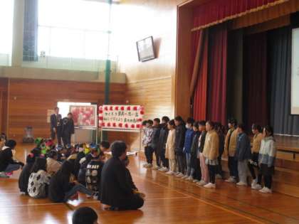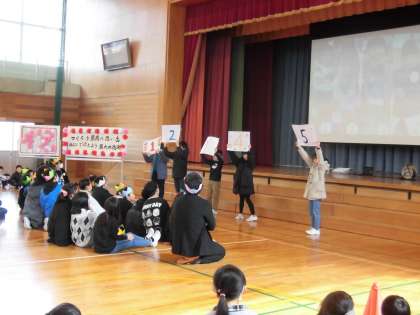 卒業を祝う会で4年生は「パーソナルクイズ」をしました。6年生が低学年の時の写真を提示して誰かを当ててもらったり、6年生の中で一番漢字が得意な人は誰なのかとクイズにチャレンジしてもらったりしました。6年生のみなさんが笑顔で楽しんでおられる姿を見て、4年生もうれしい気持ちになっていました。