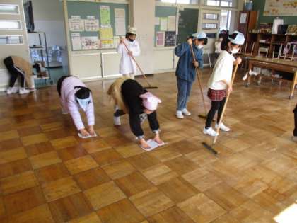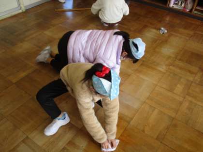 教室の床をワックスがけするため、床をきれいにしました。雑巾がけをしたり、汚れをこすって落としたりしました。力を入れてこすり、汚れが落ちたときには「やったー」と喜んでいました。