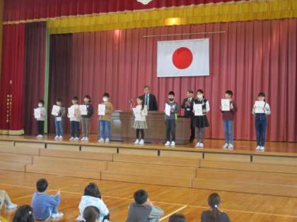 50m走の平均タイムで競う、きときとチャレンジランキングにおいて、なんと全学年が入賞しました。修了式の前に、その受賞伝達式を行いました。