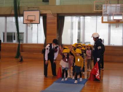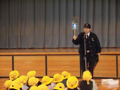 交通安全教室が行われ、警察署の方や交通指導員の方に道路の安全な歩き方を教えていただきました。子供たちは信号が青になってもすぐには渡らないことを意識して練習していました。