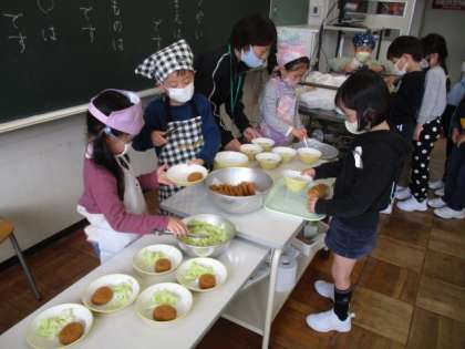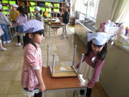 今日から給食と掃除が始まりました。給食の準備も掃除も友達と協力して上手にできていました。初めてのことでもがんばっています。