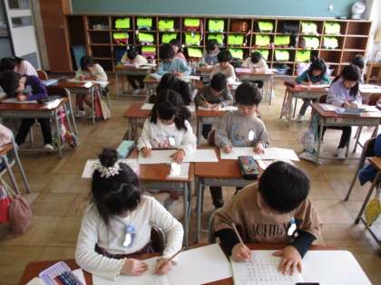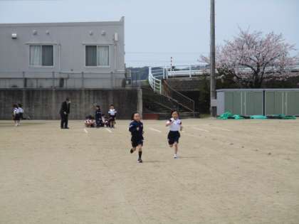 国語や算数、体育など初めての授業ですが、どの時間も楽しんでいます。50メートル走では、ゴールまで力いっぱい走りました。