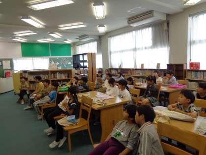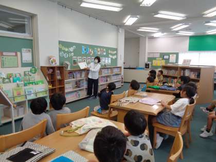 今日は、図書館司書の先生に読み聞かせをしていただきました。明日の運動会にちなんで、「おさるのジョージ うんどうかいにでる」のお話を聞きました。「こんな運動会があったら、おもしろいな」と、みんな楽しそうに聞いていました。