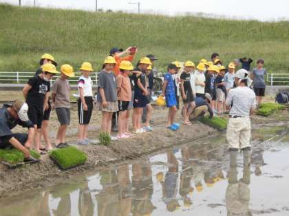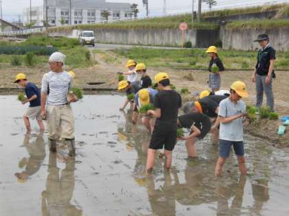 5年生は初めての「田植え体験」をしました。地域で農業を営む方々に丁寧に教えていただきながら、手植えと田植機の両方を体験しました。初めは足で入ることをためらっていた子供もいましたが、一端足を踏み入れると、慣れた手つきで楽しみながら植えていました。手植えと田植機を比べることで、昔の人の苦労や機械の便利さにも気付いていたようです。お世話になった方々本当にありがとうございました。