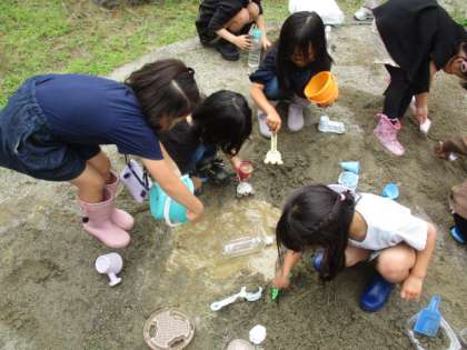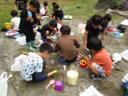 図画工作科では砂場で造形遊びをしました。子供たちは大きな穴を掘って水を流したり、型に砂を入れていろいろな形を作ったりしていました。まだまだ遊びた足りないというくらいに楽しんでいました。