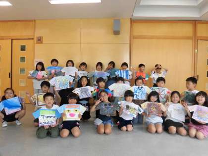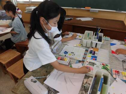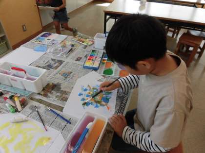 水彩絵の具で描いた模様を使ってオリジナルのTシャツを作成しました。水の量や混ぜる色を工夫し、自分なりのいいかんじを見つけて作品を仕上げることができました。