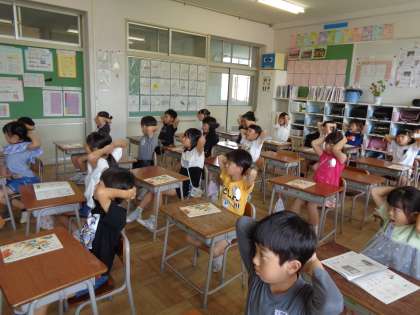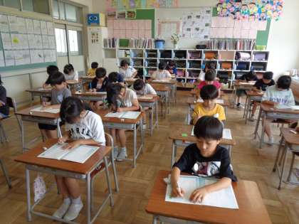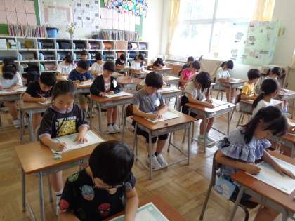 書写の時間のはじめに、書写体操をしています。ます体や指をほぐします。そして「足はぺったん、背中はぴん」など姿勢の確認をし、正しいえんぴつの持ち方で、一文字一文字丁寧に書いています。