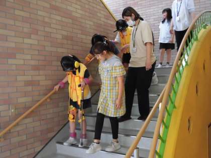 高齢になると起こる体の変化を知った後で、実際に高齢者の体の動きになるキットを用いて、体験しました。箸を使ったり、階段を上り下りする際に、思うように体が動かないことを実感していました。