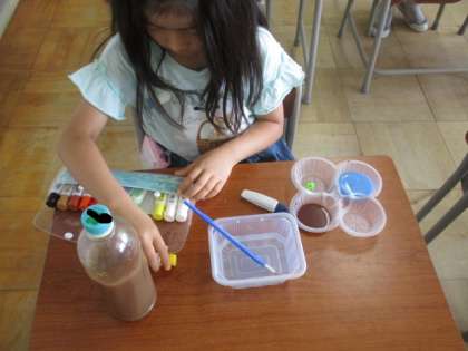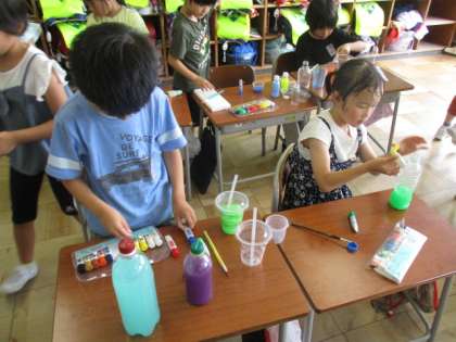 図画工作科では、透明な容器に絵の具と水を入れて少しずつ混ぜて、色の変化を楽しみました。混ぜる色や量を変えて、自分の好きな色を作りました。できた色水が何に見えるかを友達と話していました。