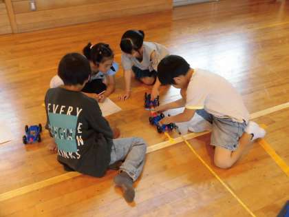 3年生 理科「風とゴムのはたらき」 公開日 2024/06/28 更新日 2024/06/28 3年生 理科では、風やゴムの力で車を走らせる実験をしています。グループで協力して何度も実験を繰り返し行ったり、お互いの結果を見せ合ったりして、どうしたら車が遠くまで走るのかを考えて試していました。