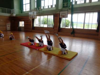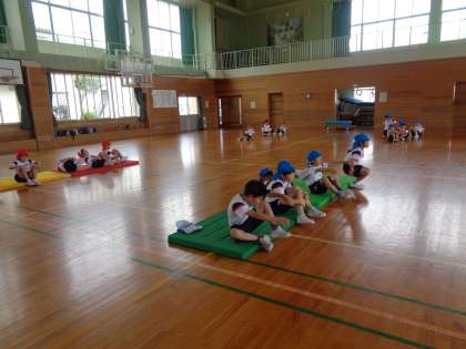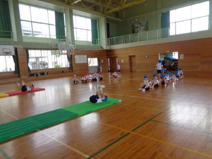 体育では、マット遊びを通して、だるまさん転がりや、スカイツリー、前転がりの練習をしています。