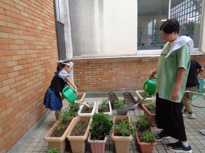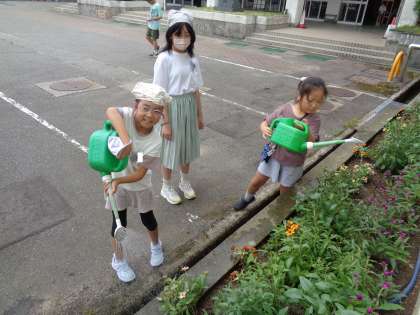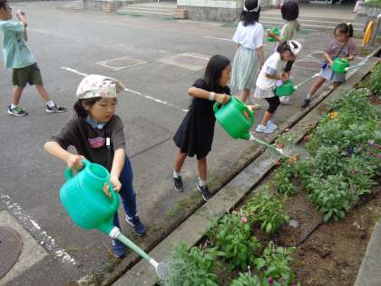 今週は、玄関前のプランターや花壇の水やりボランティアを募集しています。昼休み、委員会の子たちに教えてもらいながら、たくさんの子供たちが水やりを手伝っています。