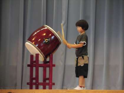 神明ショータイムに3年生から1人が和太鼓を披露しました。短い期間で一生懸命練習し、みんなの前で堂々と発表することができました。