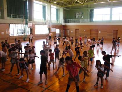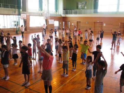 もうすぐ夏休みが始まります。夏休みは各地区でラジオ体操を行うため、練習をしました。今日は1、3、5年生が体育館で動画を見ながら練習しました。夏休み中も朝から体を動かして規則正しい生活を送ることができるといいですね。