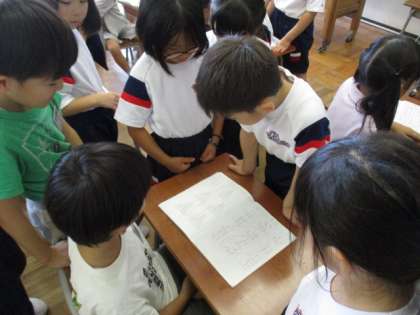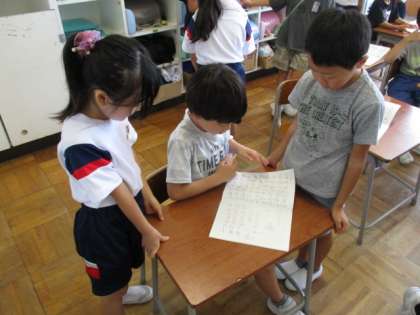 2年生がどのような自学に取り組んでいるのかを教えてもらいました。1年生の子供たちは、「たくさんの漢字を練習している」「この計算は難しそう」と2年生のがんばりを見つけながら、自学はどのようにしていったらいいのかヒントをもらっていました。