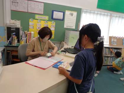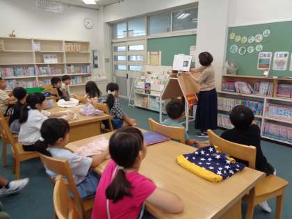 今日から、2学期の貸し出しが始まりました。本を借りたあとは、司書の先生に読み聞かせをしていただきました。今日のお話は「おつきさまは どんなあじ」でした。
