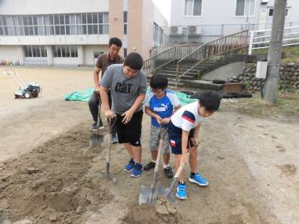 みんながけがをしないように砂場の整備をしていると、子供たちが手伝いに参加してくれました。
