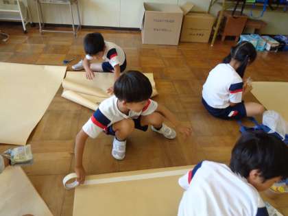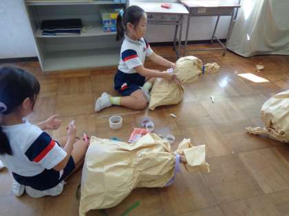 大きなクラフト紙でふくろ型をつくり、紙を丸めたり、ふくらませたりしながら、「ぎゅっ」としたくなる作品を製作中です。